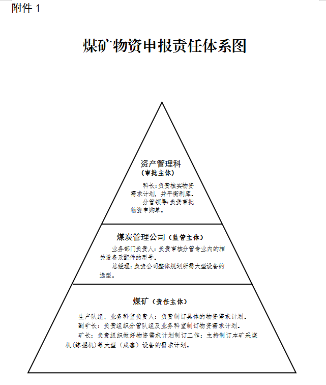1.煤炭管理公司各業(yè)務部門負責人:負責審核分管專業(yè)內(nèi)的相關設備及配件的型號是否滿足需要。其中,生產(chǎn)方面的物資由生產(chǎn)部負責審核;安全方面的物資由安全部負責審核;地測、防治水、通風等方面的物資由總工辦負責審核;機電與運輸方面的物資由機運部負責審核。